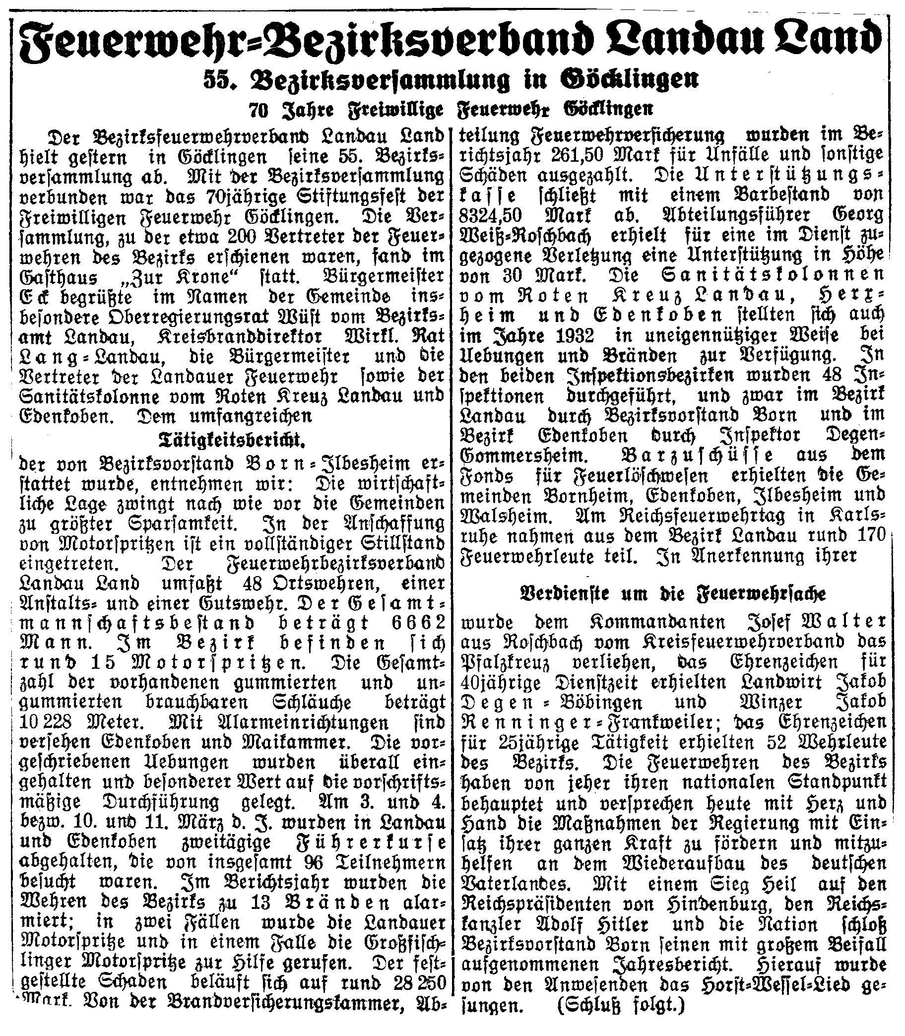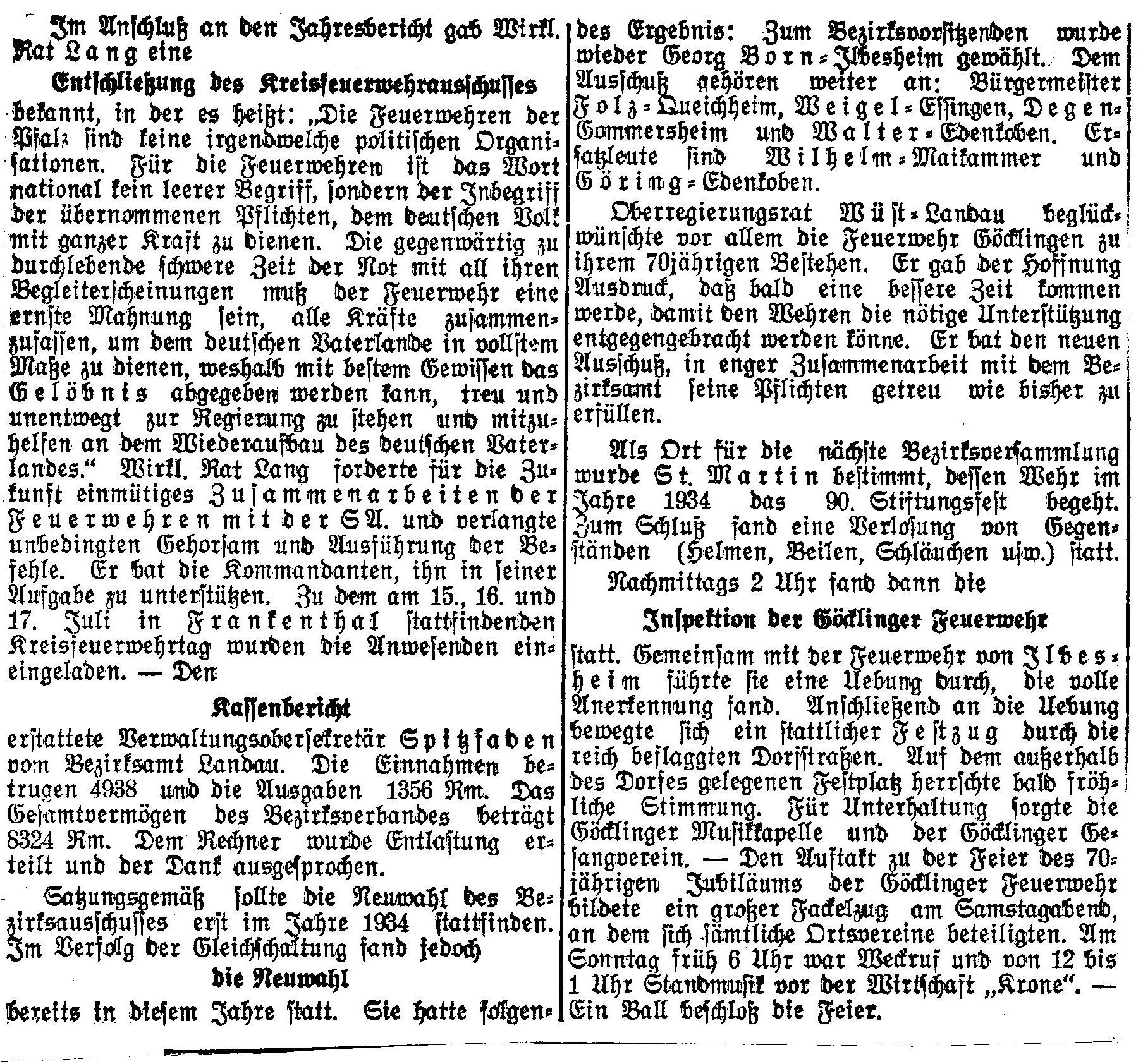 Vieles hat sich in diesen Jahren im Feuerwehrwesen verändert: Zuständigkeiten, Strukturen, Anforderungen an Personal und Technik ... aber eines ist bis heute geblieben: die tiefe Verwurzelung der Wehr in der Dorfgemeinschaft Göcklingen. Dies beweist auch die Erfolgsstory des Fördervereines der Freiwilligen Feuerwehr Göcklingen e. V., der seit seiner Gründung 2011 ein stetes Wachstum zu verzeichnen hat. Bereits 120 Mitglieder zeigen durch ihre Mitgliedschaft Solidarität mit ihrer Feuerwehr und stärken den Aktiven der Wehr den Rücken ! Und das hat Geschichte in Göcklingen ! Vor 85 Jahren wurde am Sonntag, 25. Juni 1933, in Göcklingen das "70jährige Stiftungsfest der Feuerwehr Göcklingen" groß gefeiert. Wie der "Landauer Anzeiger" berichtete, umrahmten die Musikkapelle und der Göcklinger Gesangverein die Feierlichkeiten zum Jubiläum der Feuerwehr ... um 6.00 Uhr (!) Weckruf, 10:00 Uhr Bezirksversammlung des Feuerwehrbezirksverbandes Landau Land im Gasthaus "Krone", 12.00 Uhr Standmusik, 1:30 Uhr Inspektionsübung mit anschließendem Festzug auf den Festplatz und Abends ein "Ball" ... so feierte Göcklingen seine Wehr ...