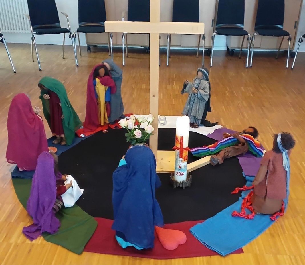 Mit biblischen Figuren wunderbar in Szene gesetzt und mit ansprechenden Texten zu den verschiedenen Figuren wie Maria die Mutter Jesus , Veronika, die weinenden Frauen, Simon von Cyrene, Josph von Arimathäa und dem Kreuzesnachbar, machten sich 20 Gläubige aus der katholischen und evangelischen Gemeinde auf einen spirituellen Weg zu Gott, der uns innerlich wachsam macht für das Leid und Elend im Hier und Heute.