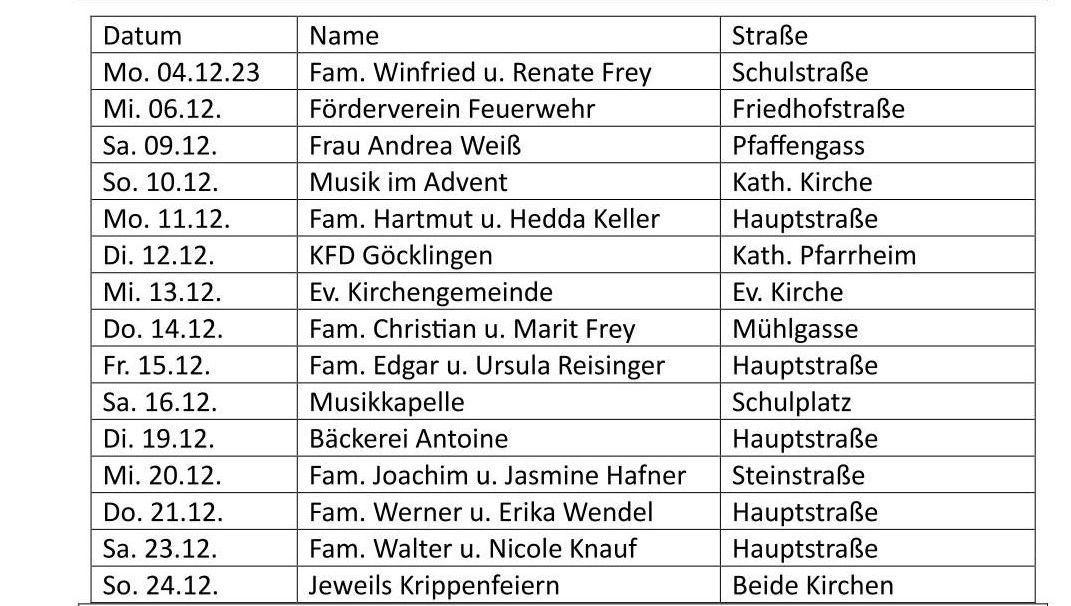 Am Sonntag, den 07. Dezember 2025 findet um 17:00 Uhr in der kath. Kirche zum Jahresabschluss „Musik im Advent“ statt. Hans Hafner hat wieder ein sehr schönes abwechslungsreiches Programm mit Musiker*innen aus unserer Gemeinde und Freunden zusammengestellt. Der Gemeinderat und alle Mitwirkenden laden Sie recht herzlich ein, gemeinsam den zweiten Advent mit Musik zu genießen. Manuela Laub Ortsbürgermeisterin